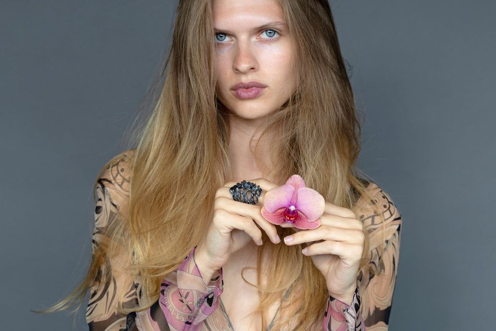The newest addition to the Banksia Design Series, with an intricately carved open structure—bold yet unexpectedly delicate. The sculptural hand-carved band tapers towards the back for a comfortable, secure fit. Available in Bronze, Silver, and Oxidized Silver.